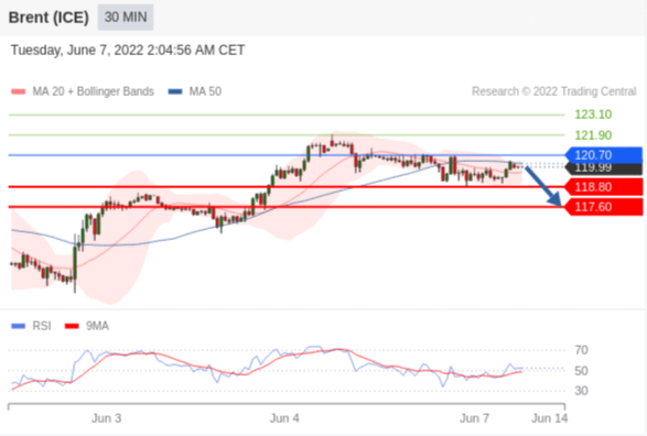 交易策略: 在 120.70 之下,看跌,目标价位为 118.80 ,然后为 117.60 。