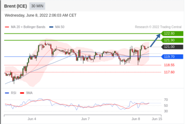 布伦特原油 (ICE) (Q2) 当日内交易策略: 在 119.70 之上 目标价位为 121.90(20220608)