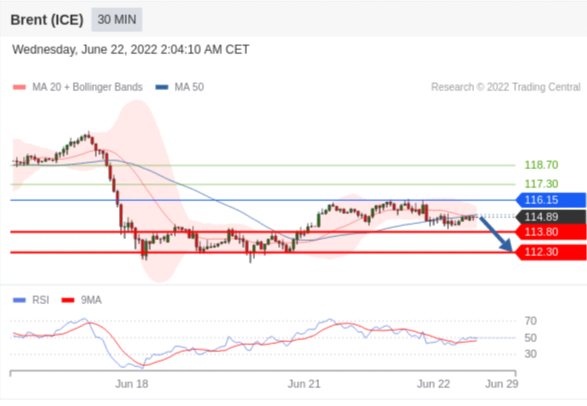 布伦特原油 (ICE) (Q2) 当日内交易策略: 在 116.15 之下 目标价位为 113.80(20220622)