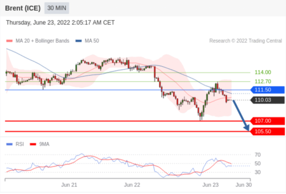 布伦特原油 (ICE) (Q2) 当日内交易策略: 在 111.50 之下 目标价位为 107.00(20220623)