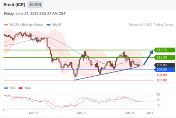 布伦特原油 (ICE) (Q2) 当日内交易策略: 在 109.00 之上 目标价位为 111.30 (20220624)