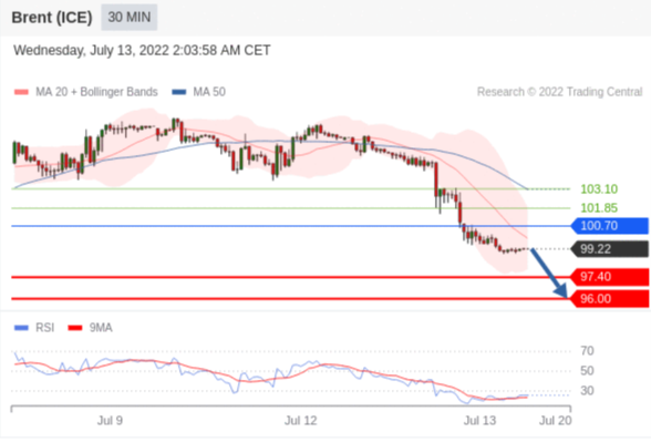 交易策略: 在 100.70 之下,看跌,目标价位为 97.40 ,然后为 96.00 。