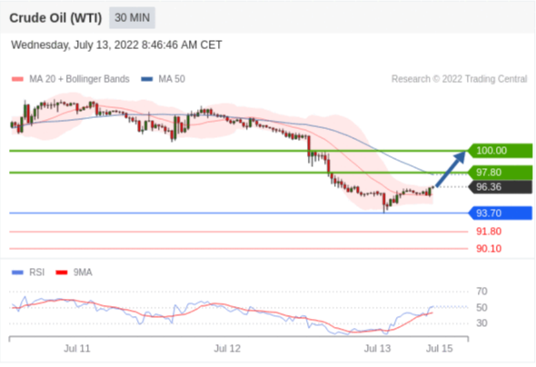 美国原油 (WTI) 期货 (Q2) 当日内交易策略: 在 93.70 之上 目标价位为 97.80(20220713)