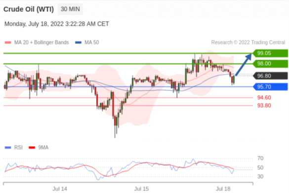 美国原油 (WTI) 期货 (Q2) 当日内交易策略: 在 95.70 之上 目标价位为 98.00(20220718)