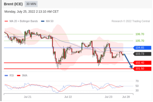 交易策略: 在 104.65 之下,看跌,目标价位为 102.35 ,然后为 101.50 。