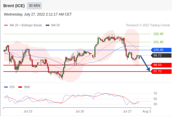 交易策略: 在 100.40 之下,看跌,目标价位为 98.50 ,然后为 97.70 。