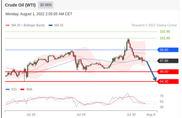 交易策略: 在 99.80 之下,看跌,目标价位为 96.00 ,然后为 94.30 。