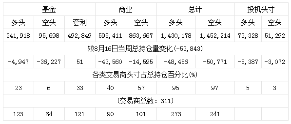 美国商品期货交易委员会(CFTC)最新公布截止8月23日当周NYX原油期货分类持仓报告: 合约单位:1000桶总持仓量:1503506