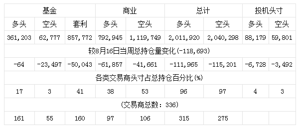 美国商品期货交易委员会(CFTC)最新公布截止8月23日当周NYX原油期货和期权分类持仓报告: 合约单位:1000桶总持仓量:2100099