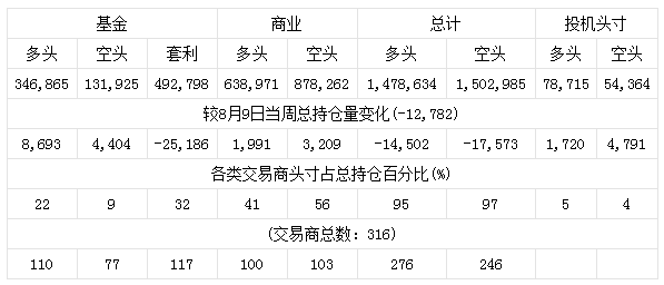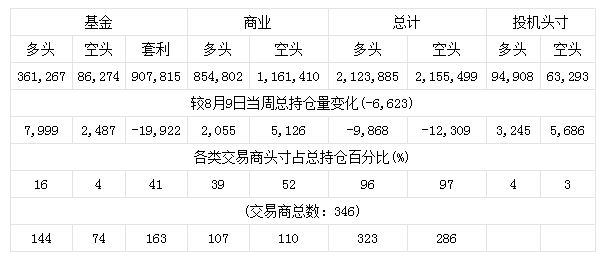 美国商品期货交易委员会(CFTC)最新公布截止8月16日当周NYX原油期货和期权分类持仓报告: 合约单位:1000桶总持仓量:2218792