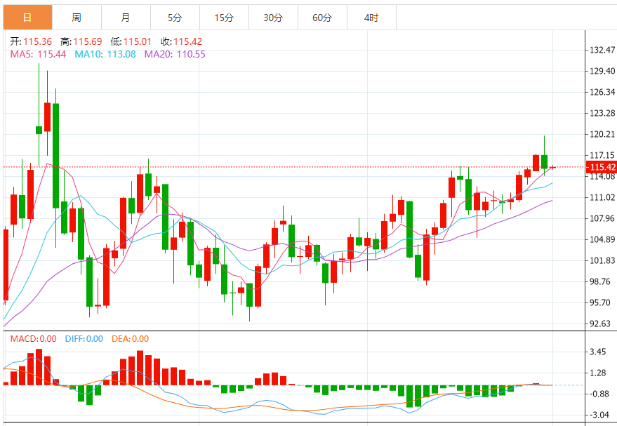 周三,原油期货上涨,因欧盟将逐步实施俄罗斯原油禁运。 WTI原油期货收盘上涨0.5%,报每桶115.26美元。 布伦特原油期货收盘上涨0.6%,报每桶116.29美元。