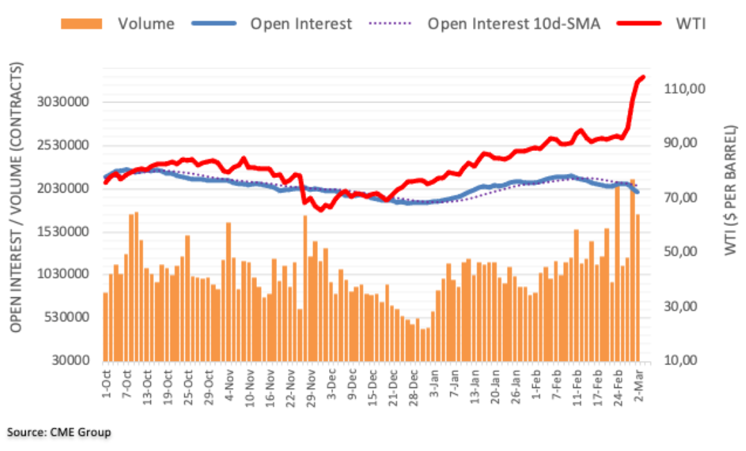 根据芝加哥商业交易所集团初步数据,周四原油期货市场的未平仓合约连续第三日下降,此次降幅超过4.3万份。与此同时,成交量扩大前一日跌势,此次下降约34.55万份合约。 WTI原油:料很快重启升势 周四WTI原油价格回调仅是短暂的,同时未平仓合约和成交量齐跌。对此,油价短期内料重启升势,下一目标为近期高点116.00