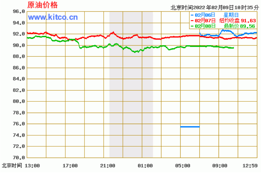 国际原油价格最新消息实时(2022年2月9日) 名称 最新价 涨跌 涨跌幅% 开盘价 昨收价 最高价 最低价 WTI 89.55 -0.23