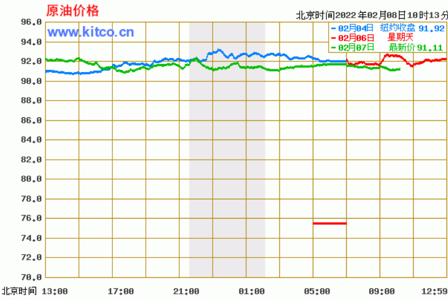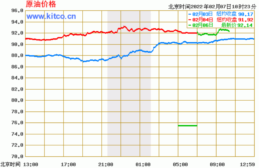 WTI原油走势图_WTI原油价格实时(2022年2月7日) 名称 最新价 涨跌 涨跌幅% 开盘价 昨收价 最高价 最低价 WTI 92.05 0.07