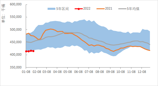 IA报告数据显示:上周美国国内原油产量减少10万桶至1150万桶/日,为2021年11月19日当周以来最低;上周原油出口减少42万桶/日至237.6万桶/日;上周战略石油储备(R)库存减少190万桶至5.88亿桶,降至2002年10月以来最低。 除却战略储备的商业原油库存减少104.7万桶至4.151亿桶,减少0.3%,为2021年7月16日当周以来最