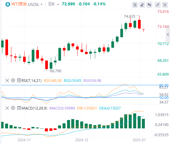在美元走强的情况下,WTI价格小幅走低。然而,对供应中断的担忧可能会限制WTI价格的下行空间。截至目前,WTI原油报价72.69美元,Brent原油报价75.83美元。
