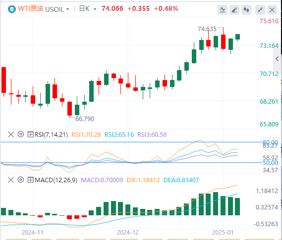 4小时图表显示,枢轴点73.20美元上方盘整,表明谨慎乐观。直接阻力位在75.24美元,下一个目标在76.48美元和77.82美元,反映了潜在的上行势头。