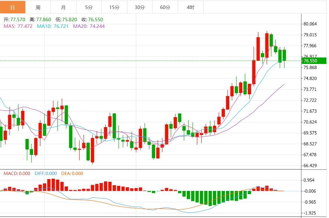 技术面来看,相对强弱指数(RSI)已攀升至超买水平,上一次出现这种情况是在2024年4月,当时油价达到87.20美元的峰值,随后回落至68美元。目前,原油距离牛市突破仅一个阻力位之遥,2023年9月至2024年8月受关注的三角形形态下边界处于80美元区间。