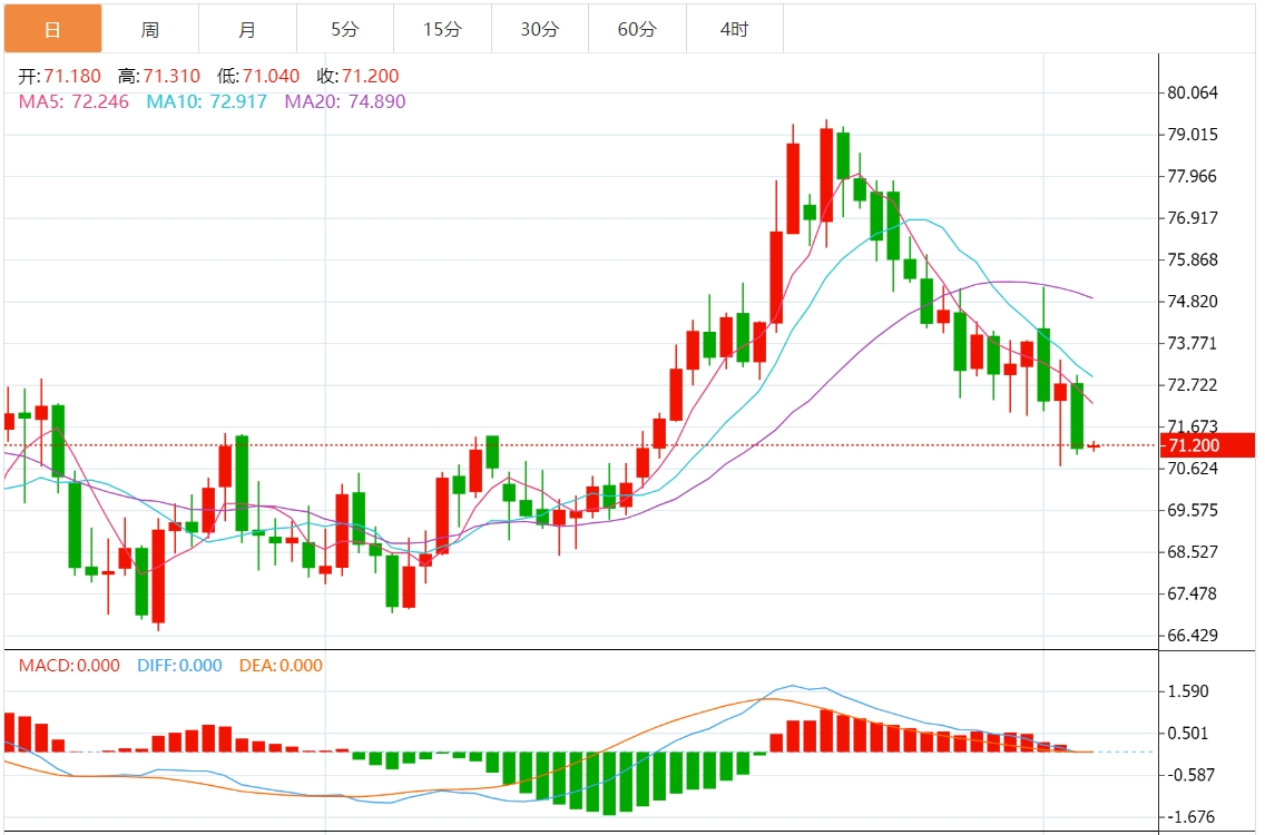 日线图显示,原油等待负面因素推动价格继续下跌,在跌破72.30美元后,开启向看跌目标价位的下行走势,首个目标价位为71.2美元,进一步目标为70.30美元。除非向上突破73.90美元并站稳其上,否则今日看跌趋势将持续。今日预计交易区间在支撑位71.20美元和阻力位74.20美元之间。