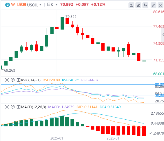 但是,需要谨慎。50天EMA位于72.31美元,200天EMA位于73.65美元,两者都是可能阻碍上行走势的阻力位。如果USOIL跌破70.98美元,我们可能会看到剧烈的抛售压力,支撑位在70.12美元和69.28美元附近。现在这是一个微妙的平衡。