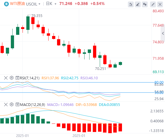 不利的一面是,支撑位在69.14美元,更深的回调可能会测试68.00美元。最近的趋势线突破表明势头仍处于上行趋势,但需要果断突破71.81美元才能增强看涨信心。