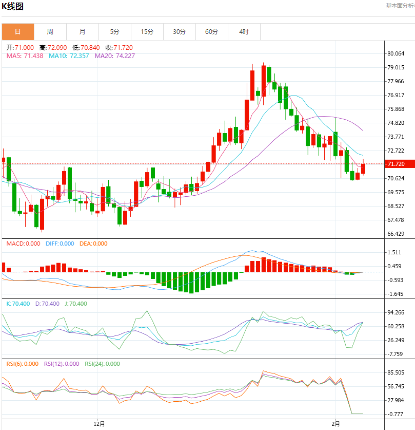 技术面上看,上周五国际油价承压在72关口下方呈现弱势震荡整理。短线上虽在70整数关口上方出现一定支撑企稳形态,但是短中期均线依旧空头排列向下发散,74关口依旧构成短期空头强阻压制。接下来建议参考日线MA10均线72.5美元附近范围压制,日内保持顺势参与为主。今日油价短线关注下方70关口支撑,若跌破此位置恐进一步迎来加速下行回落。