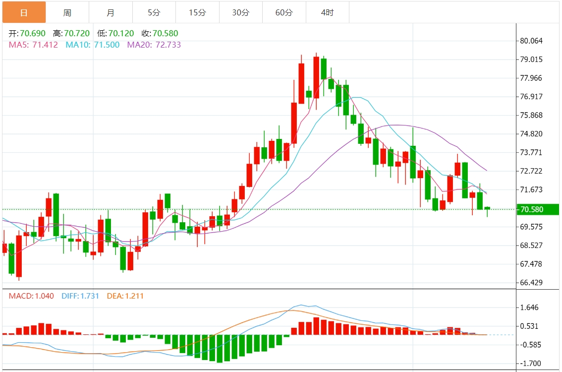 技术层面上来看,目前已经已经跌破重要支撑区间,若短期直接破位70美元整数关,则不排除加速下行的可能性,留意技术指标是否维持震荡下行结构,从而推动油价继续走低。