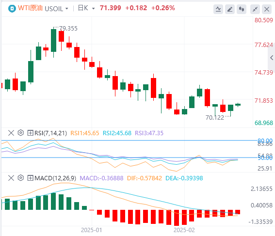 预计美国原油(CLc1)价格将小幅攀升至每桶71.88美元,因在70.07美元支撑位上方的盘整行情有所延续。