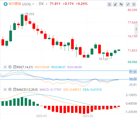 TradeNation高级市场分析师DavidMorrison表示,原油似乎正在当前水平附近建立支撑。WTI原油正在70美元上方找到底部。同时,日线MACD趋于平缓,表明自1月中旬油价见顶以来一直在增强的下行势头正开始减弱。然而,当前油市仍处于不确定时期。若俄乌达成停火协议,或会导致之后原油供应量激增。