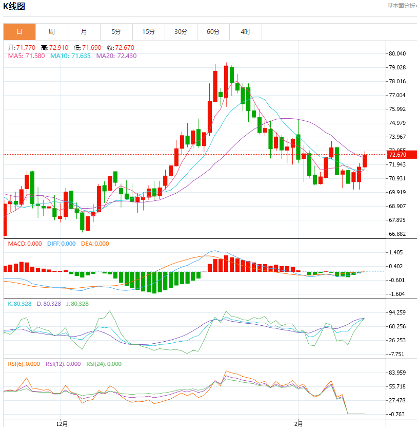 技术面上看,昨日国际油价震荡交投中延续压制空头回落走跌。亚欧盘时段,原油价格企稳71.1关口小幅反弹回升,午后欧盘冲高刺破72关口压制回落迅速走跌,晚间美盘二次下探至70.9关口附近反抽震荡收盘,日K线报收探底回升震荡中阳。今日油价短线关注上方72.3-72.5附近阻力,日内保持顺势参与为主。