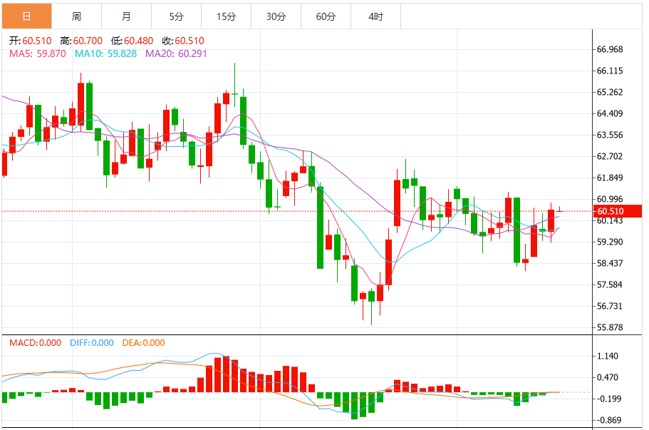 目前关键支撑依然是59.40和58.48,其中59.40已经跌破目前转换成为了压力位。于是压力位是59.75,59.40,支撑位为58.48和下面的57.30。