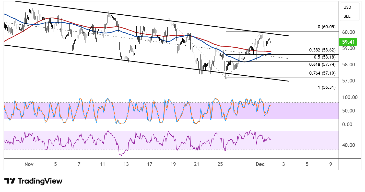 价格目前徘徊在每桶59.41美元左右,因在通道阻力处被拒绝,跌破附近支撑可能引发向斐波那契延伸位的走势。38.2%的延伸位于58.62美元,如果卖出压力加大,这可能是首个下行目标。