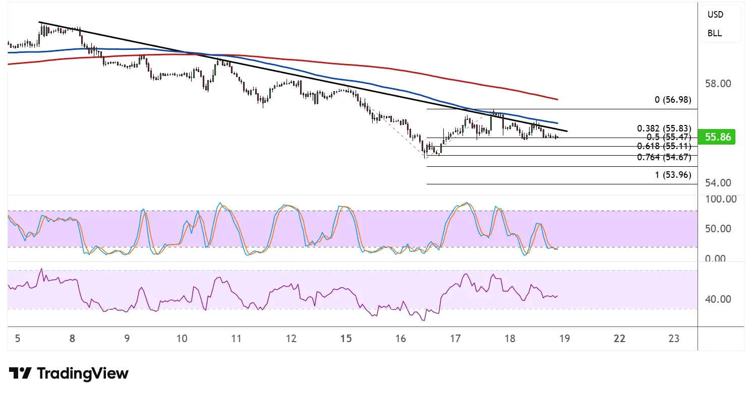 价格目前徘徊在每桶55.86美元附近,似乎正在测试下降趋势线阻力与61.8%斐波那契回撤位55.11美元交汇的区域。