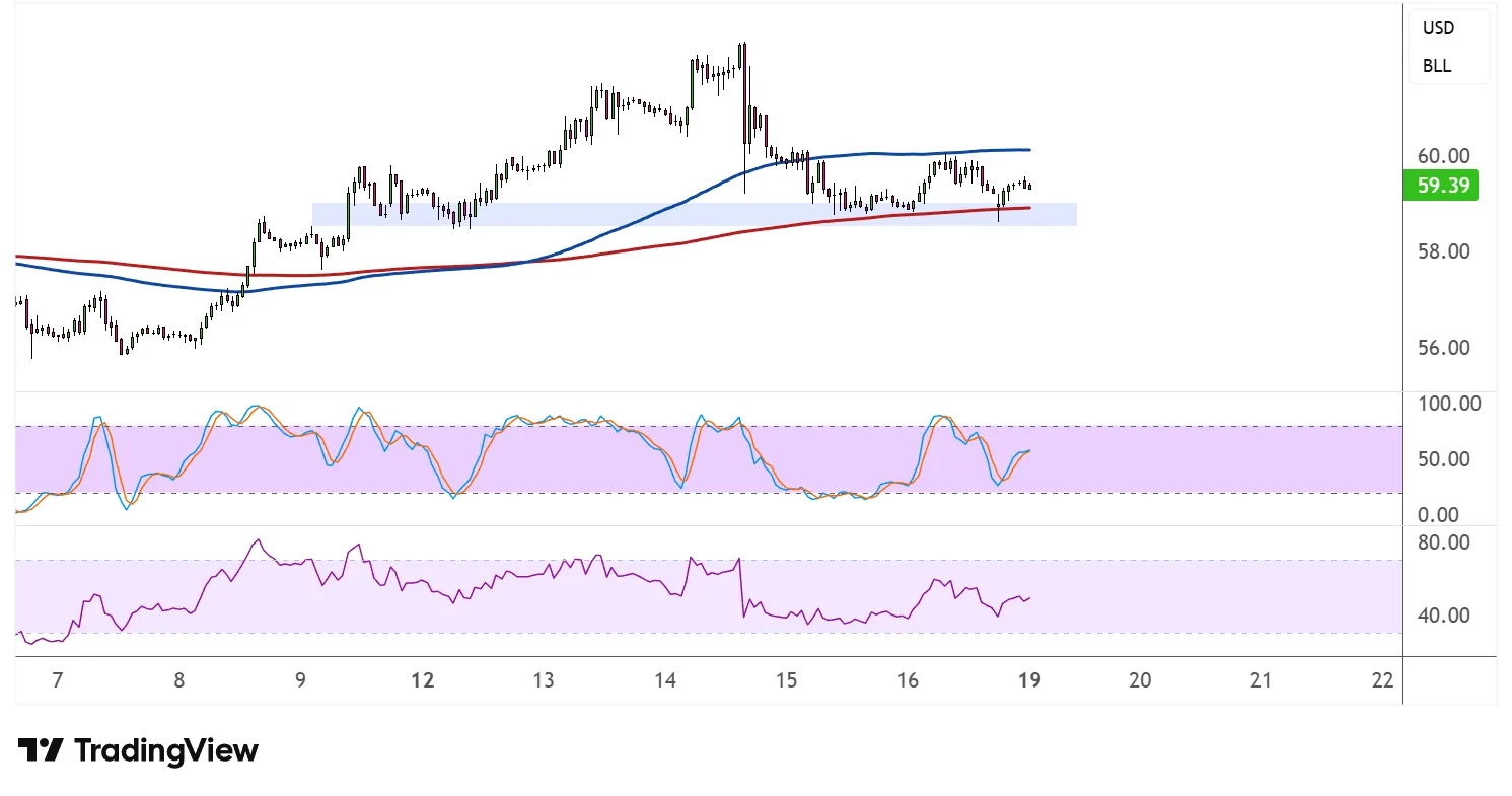 价格目前正在测试59.00-59.50美元附近的颈线支撑,跌破该水平可能确认看跌动能转变。