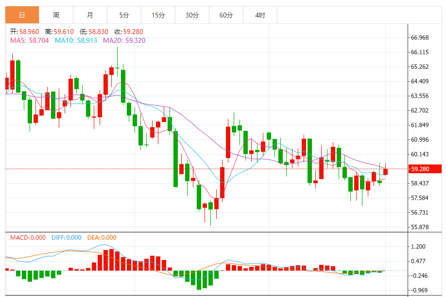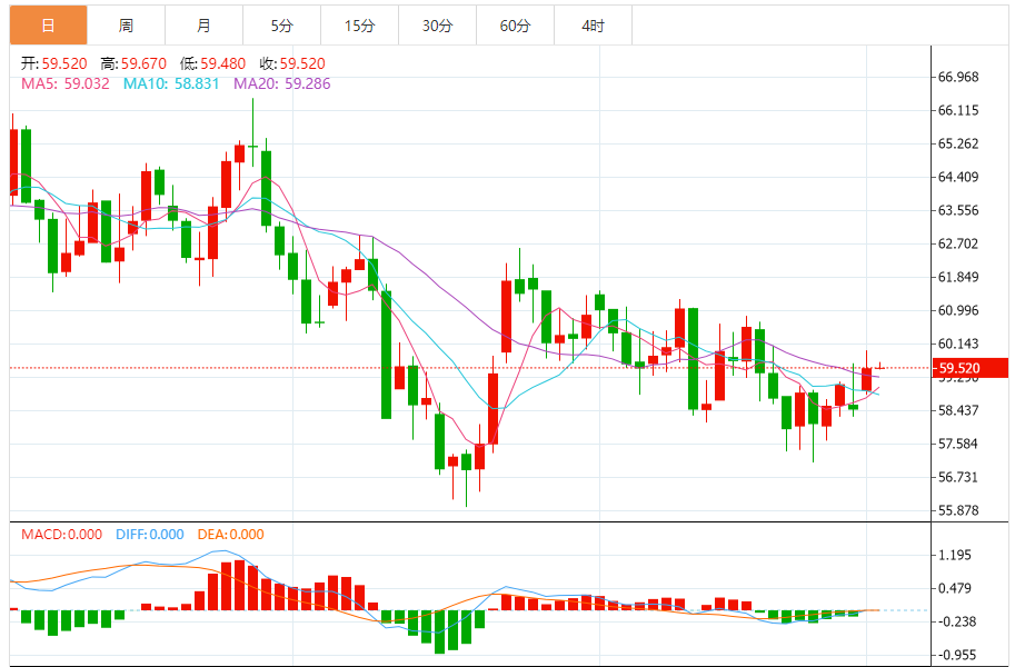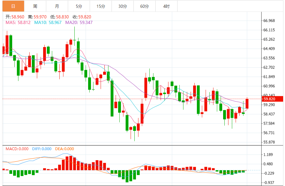 周一(12月1日),美原油价格交投于59.830美元/桶附近,涨幅为2.19%。 原油在最近的盘中交易中上涨,此前它成功地迅速回补早期的跌幅,并转为盘中涨幅,受益于对A50支撑位的依赖,同时受到短期内退出小幅下跌通道的影响,这为其收盘和反弹提供了额外的推动力。 在相对强弱指标消化了超买状态之后,此次上