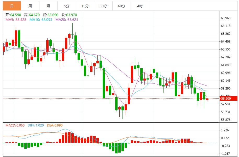 周二盘中,WTI原油报57.840,跌幅1.67%。 今日分析:在58.20之上,看涨,目标价位为59.05,然后为59.50。 技术点评:随后的阻力位是59.05,然后为59.50。 支撑位:58.2057.8057.40 阻力位:60.1059.5059.05 (亚汇网编辑:冰凡)