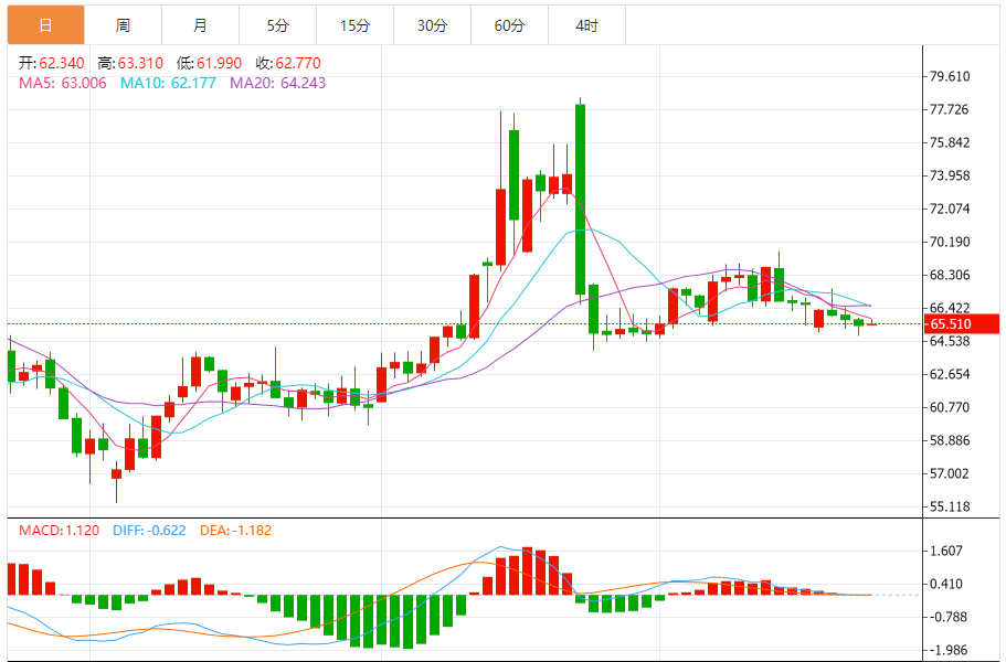 基本消息面 周三(7月23日),美原油价格交投于65.610美元/桶附近,涨幅为0.46%。 周二美盘时段,国际油价小幅上涨。布伦特原油期货下跌0.35%,至每桶68.78美元;美国WTI原油也下跌0.59%,报每桶65.55美元。WTI8月合约即将到期,交易更活跃的9月合约也下跌0.35%,至65.72美元。近期油市缺乏明确方向。
