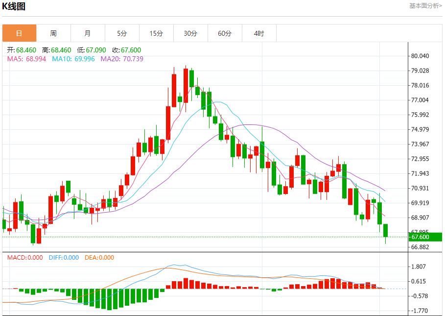 周三盘中,WTI原油报66.920,跌幅1.96%。 今日分析:在67.65之下,看跌,目标价位为66.10,然后为65.70。 技术点评:跌破67.65,为空头信号,向下的目标将会是66.10。 支撑位:66.1065.7065.50 阻力位:68.5568.1067.65 (亚汇网编辑:冰凡)