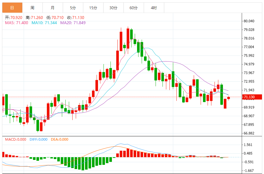 油价整体市场前景仍谨慎看涨。然而,持续的需求担忧和潜在的地缘政治发展,特别是伊朗,带来了下行风险。 今日原油价格技术分析: 技术面上看,昨日国际油价亚欧盘持续下行回落走低,走势接连跌破72美元、71美元整数支撑位,晚间美盘油价加速下行到达70.2附近后低位震荡收盘,日K线报收阴线实体。均线系统出现