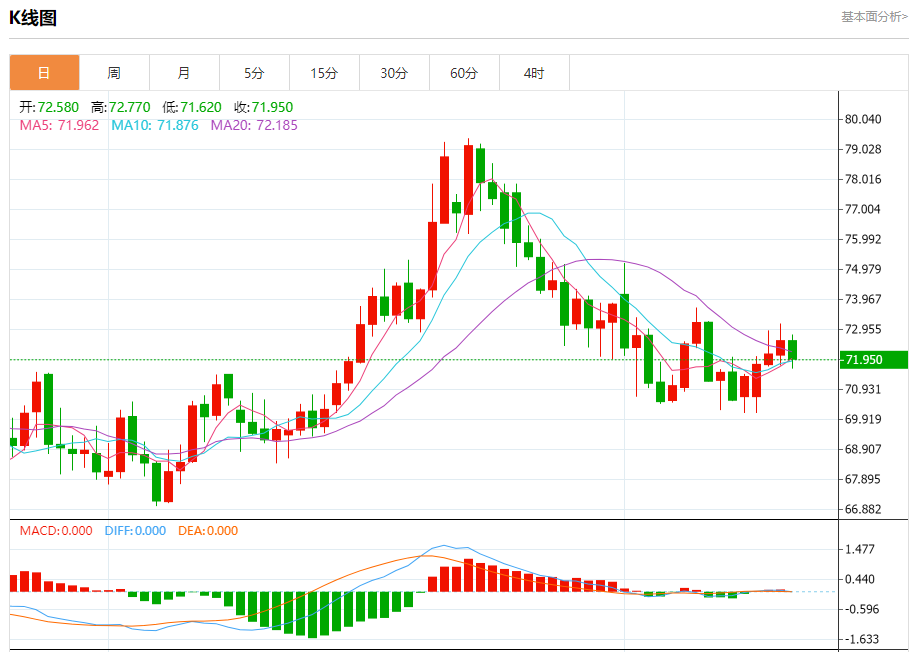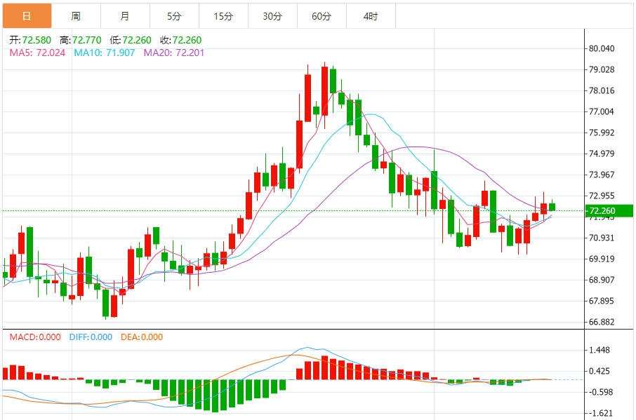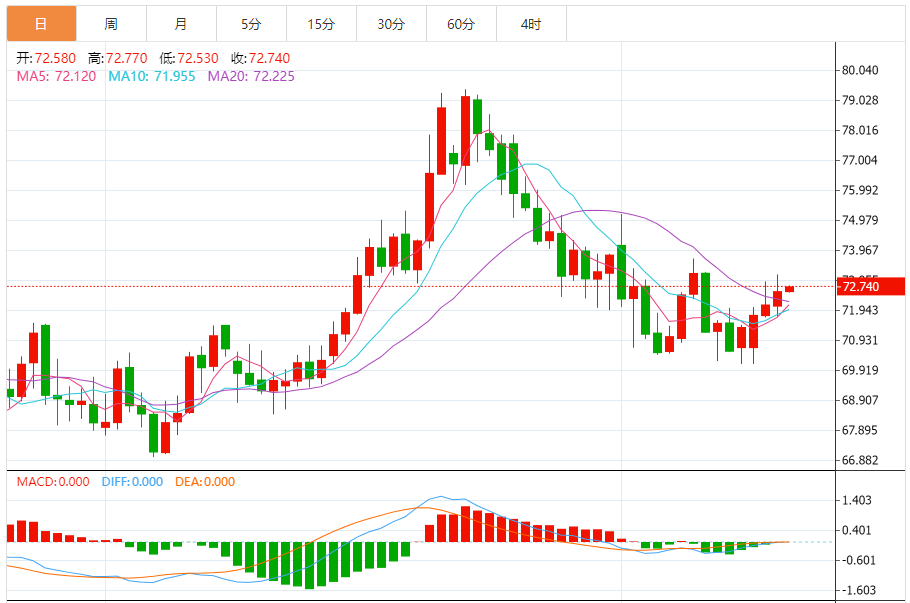 尽管美国总统特朗普重返白宫后对全球能源政策频频施压,油市却未出现剧烈波动。 今日原油价格技术分析: 技术面上看,昨日国际油价震荡交投中迎来震荡回升,晚间美盘加速冲高刺破72.9一线压制回落震荡收盘,日K线报收冲高回落震荡小阳。短期来看,油价未能有效突破并站稳73关口前,市场或