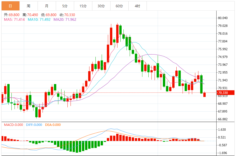 周一盘中,WTI原油报70.380,跌幅0.00%。 今日分析:在70.90之下,看跌,目标价位为69.80,然后为69.35。 技术点评:跌破69.80位置,将会引发下跌至69.35。 支撑位:69.8069.3568.75 阻力位:71.7071.3070.90 (亚汇网编辑:冰凡)