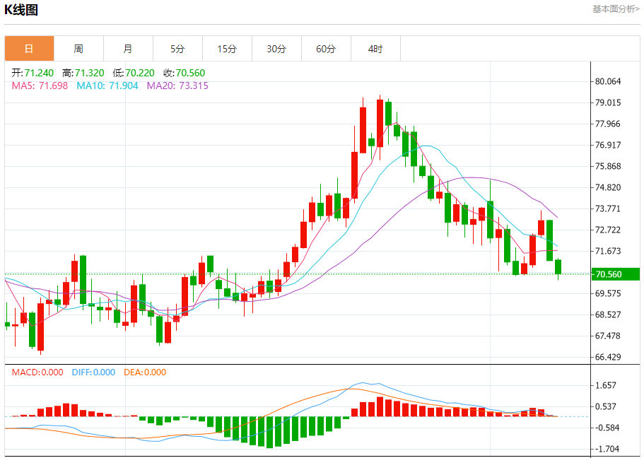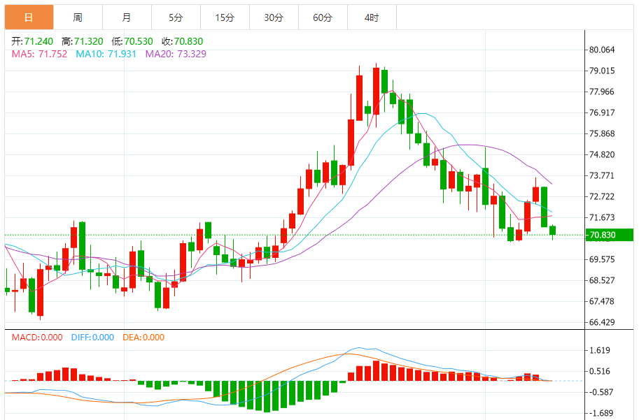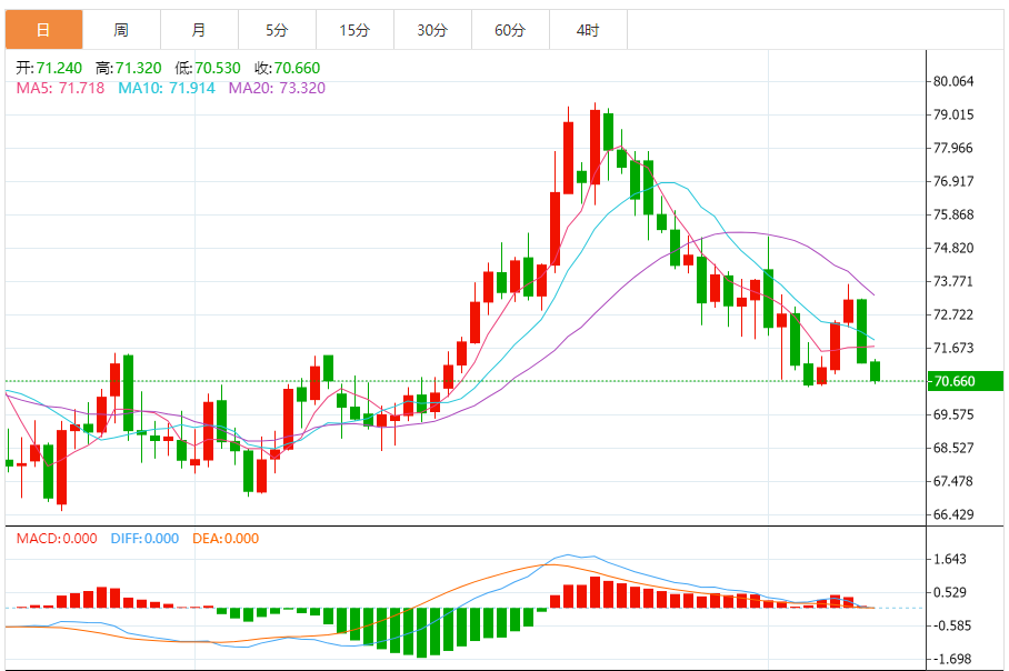 周四盘中,WTI原油报70.540,跌幅1.16%。 今日分析:在71.05之下,看跌,目标价位为70.10,然后为69.80。 技术点评:RI技术指标看跌,有进一步下降空间。 支撑位:70.1069.8069.20 阻力位:72.1071.7071.05 (亚汇网编辑:冰凡)