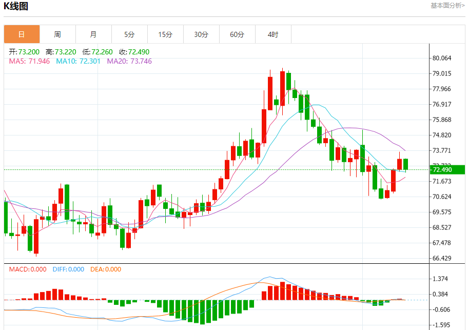 周三盘中,WTI原油报72.460,跌幅1.17%。 今日分析:在72.95之下,看跌,目标价位为72.10,然后为71.65。 技术点评:跌破72.95,为空头信号,向下的目标将会是72.10。 支撑位:72.1071.6571.30 阻力位:73.6573.4072.95 (亚汇网编辑:冰凡)