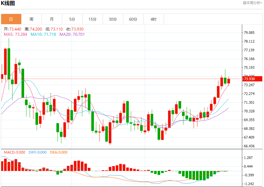 周二盘中,WTI原油报73.950,涨幅0.53%。 今日分析:在73.60之上,看涨,目标价位为74.45,然后为75.00。 技术点评:在73.60之上,为多头信号,向上的目标位为74.45。 支撑位:73.6073.1072.70 阻力位:75.4075.0074.45 (亚汇网编辑:冰凡)