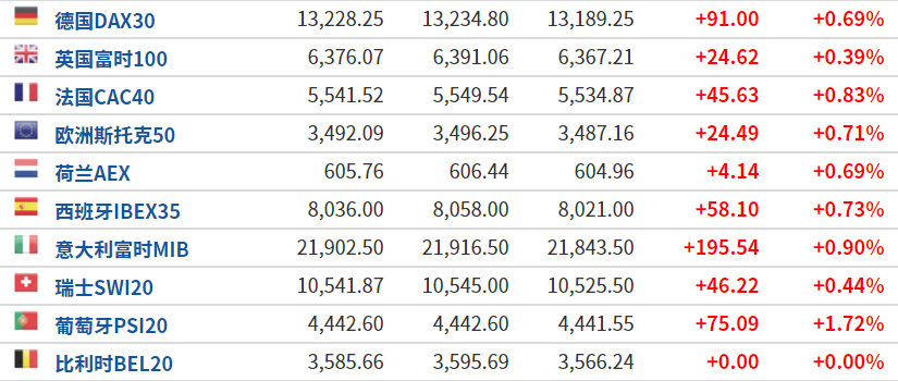 欧洲主要指数全线走高,德国DAX指数涨0.69%,英国富时100指数涨0.39%,法国CAC40指数涨0.83%,欧洲斯托克50指数涨0.71%。