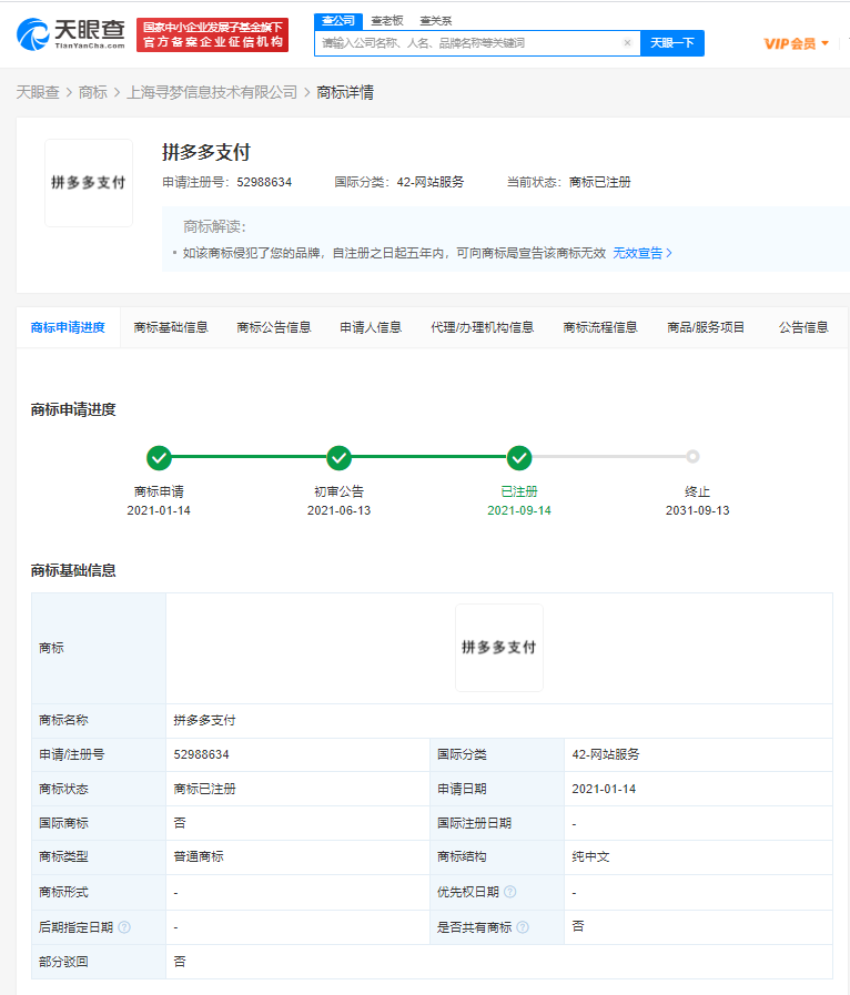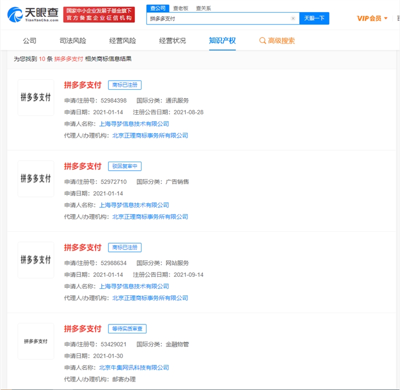 近日,天眼查App显示,拼多多关联公司上海寻梦信息技术有限公司申请的多个“拼多多支付”商标已注册成功,相关商标最早申请于2021年1月14日,国际分类涉及网站服务、科学仪器等。