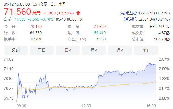 上周标普500一周涨3.65%,纳斯达克综指涨4.14%,道琼斯工业平均指数涨2.66%。 拼多多美股上周累计跌3.37%,上周总成交额27.87亿美元,截至上周收盘,美股股价为69.76美元,市值为2439.44亿美元;美股本月累计跌幅2.16%,今年累计涨幅19.66%,近52周累计跌幅32.76%。