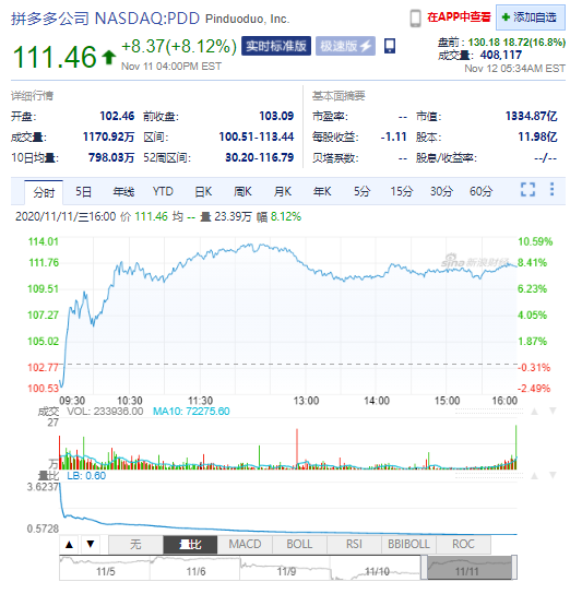 基本消息面 11月12日(周四),美股三大指数期货在盘前时段集体下跌,道指期货跌近200点。 双十一后首个交易日,阿里巴巴美股盘前涨0.21%,京东盘前涨超1%,拼多多盘前涨超近15%。 相关新闻消息 拼多多Q3亏损大幅收窄,股价盘前大涨近15% 11月12日,拼多多发布2020年Q3财报,本季度营收14