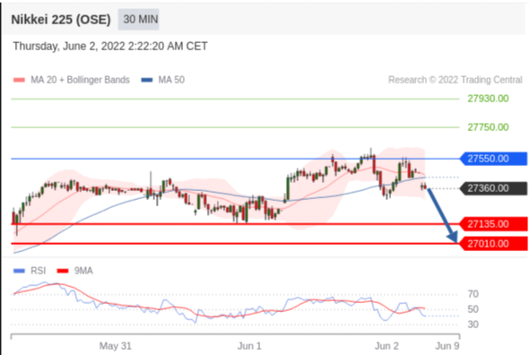 日经225股指期货 (OSE) (M2) 当日内交易策略: 在 27550.00 之下 目标价位为 27135.00 (20220602