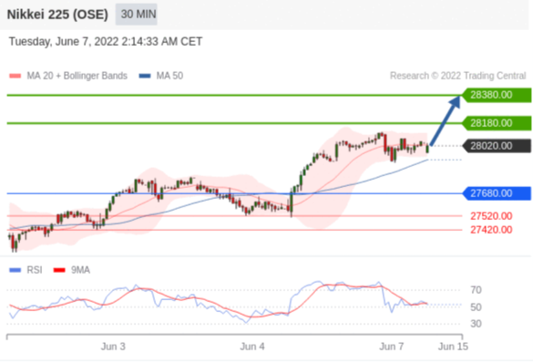 日经225股指期货 (OSE) (M2) 当日内交易策略: 在 27680.00 之上 目标价位为 28180.00(20220607)